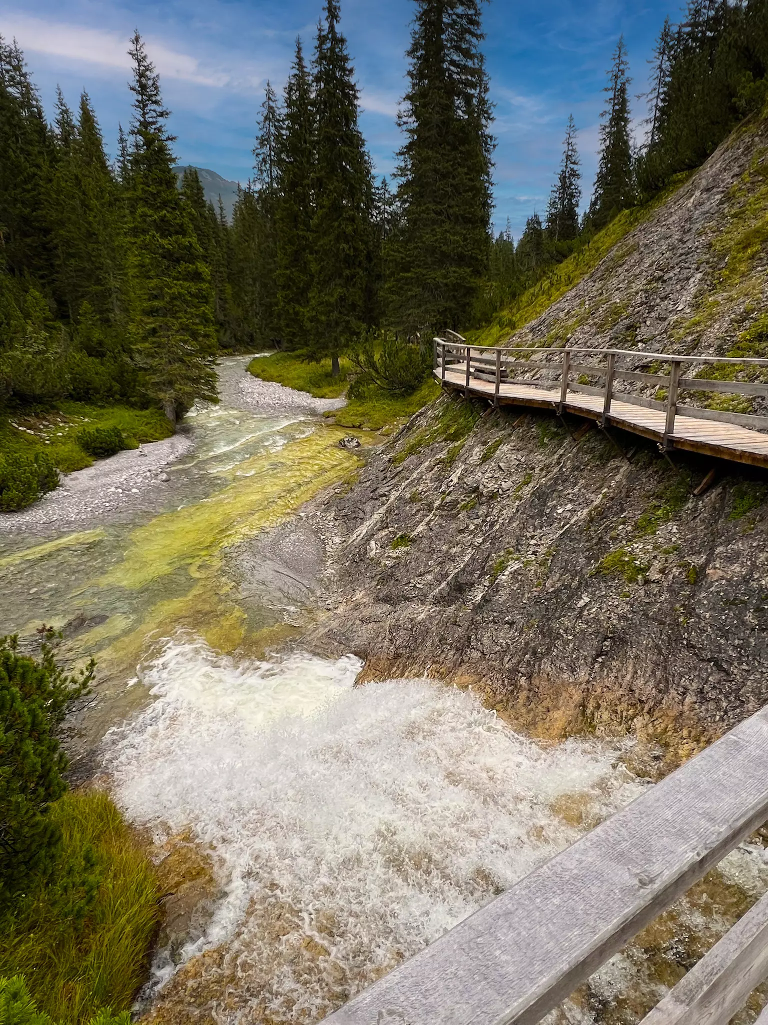 Der Lechweg endet schließlich am Lechfall in Füssen, wo sich der Lech tosend in die enge Klamm stürzt und seine Kraft ein letztes Mal eindrucksvoll zeigt 🌊. Ein symbolträchtiger Ort, um auf die zurückliegenden Tage voller Naturmomente, Freiheit und Weitblicke zurückzublicken.